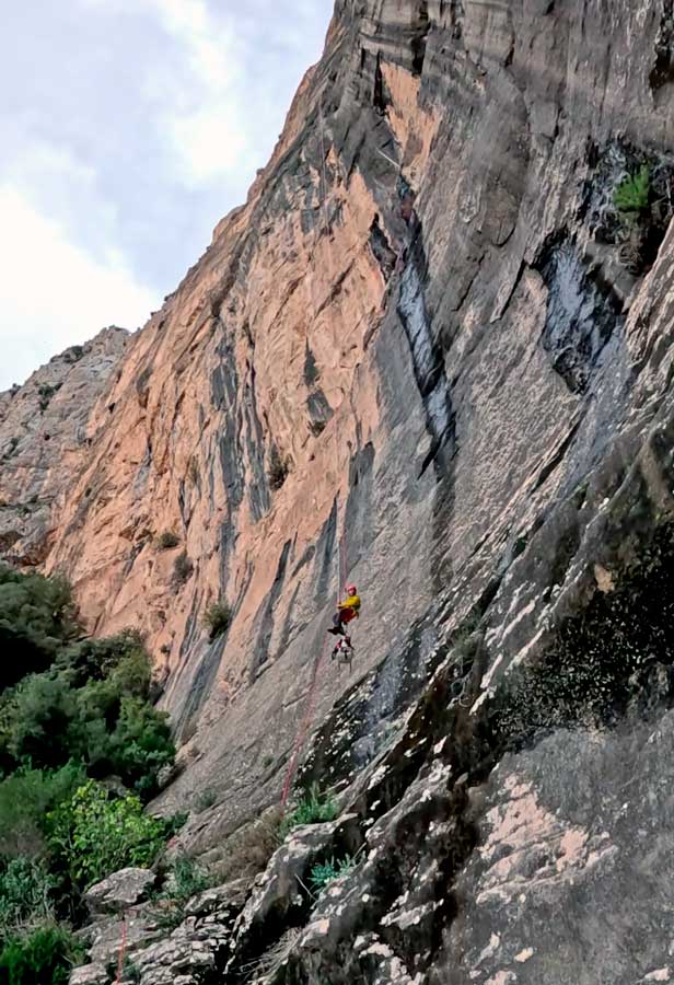 Acabada la gran vertical tenim dues opcions, la primera és seguir pel barranc, una opció força feixuga amb tants metres de corda a l'esquena.