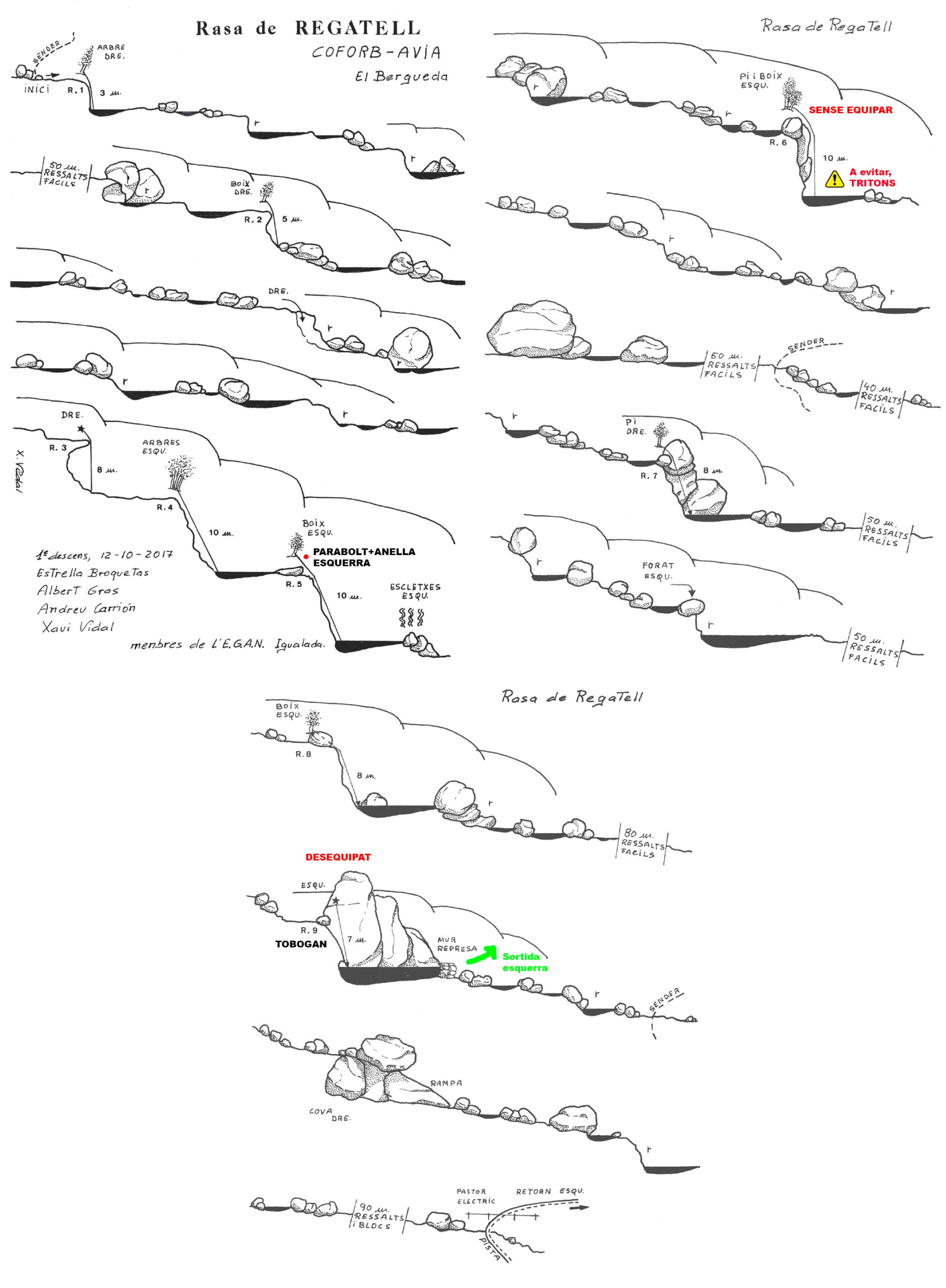 El barranc ara es convertirà en una successió molt esclarissada de ressalts on no trobarem el R6 que es ressenya en el croquis de l'obertura de la Rasa del Regatell, ja que es desinstal·là perquè conduïa a un toll on hi proliferaven de forma abundant les cries de tritó. El podrem desgrimpar amb compte i agafant-nos als boixos i arbustos per l'esquerra.