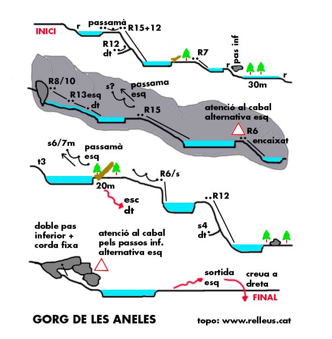 Aquí trobarem un petit tram amb arbres, uns 30 metres potser, i que després d'un ressalt ens durà a un bloc encastat al començament d'una gran gorja i inici d'un passadís que zigzagueja, amb una primera reunió a l'esquerra, i que amb un ràpel de 8/9 metres ens deixa en una altra reunió que amb uns 13 metres ens deixarà ja fora d'aquest passadís, en un toll d'aigua, al qual es pot saltar si accedim al passamà ascendent que hi ha a l'esquerra.