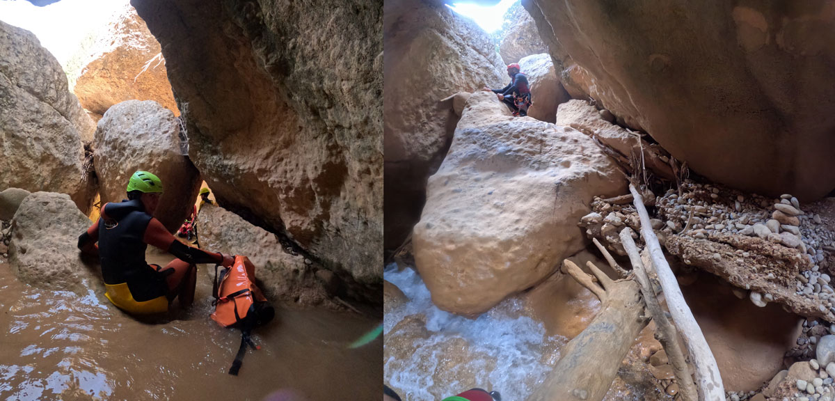 Actualització: Passades les intenses pluges de la primavera de 2025 el descens ha canviat significativament, havent-se desviat per complet el curs de l'aigua en un punt molt concret dins el caos de blocs, havent excavat fins a dos metres de sediment donant pas a un passadís inferior, per ara impenetrable. El pas habitual és a la dreta, amb una corda fixa des d'un pont de roca per marcar el lloc.