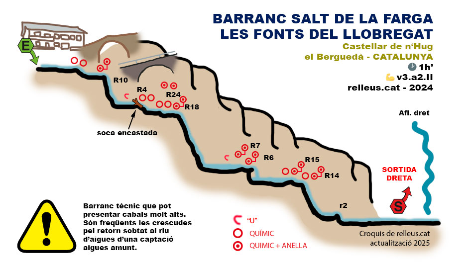 Cal remarcar que totes les instal·lacions dels 3 primers ràpels (el barranc en té un total de 4), obliguen a baixar per l'actiu, cosa que ens podria complicar les coses en cas de cabal molt abundós.