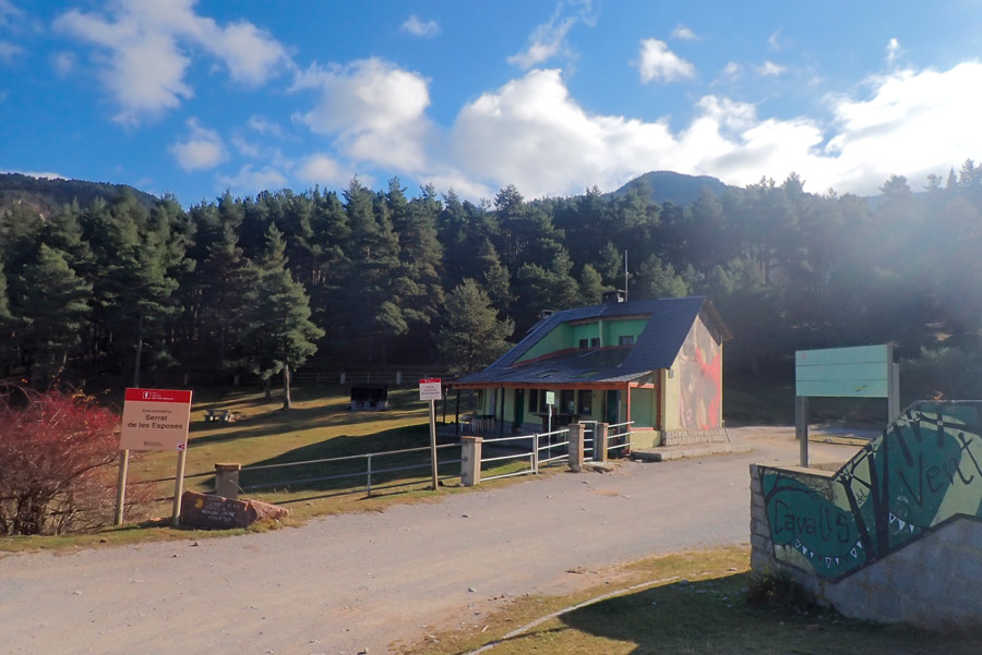 Retornarem però al camí de Cavalls del Vent, degudament senyalitzat amb uns punts de pintura taronja i que en poca estona i suaument ens remunta fins al preciós indret on trobem el Refugi del Serrat de les Esposes i on arriba una pista en molt bones condicions per al trànsit de vehicles que puja des de Riu.