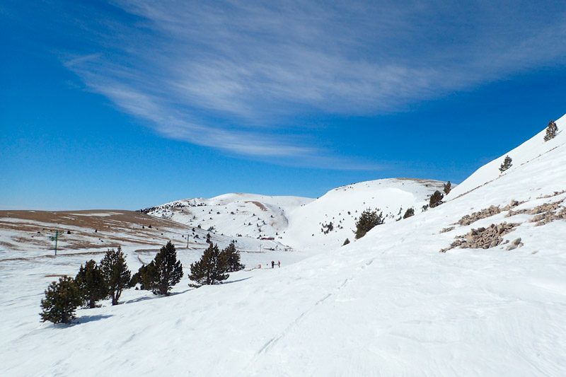 Si seguim la pista que ens hi porta, aquesta de seguida tomba a l’esquerra just abans del telecadira i resseguint la bassa pel seu extrem sud. Remuntarem per aquesta pista uns metres fins a trobar a l’esquerra el camí que remunta una rasa evident, vestida d’un bonic bosc de pins.