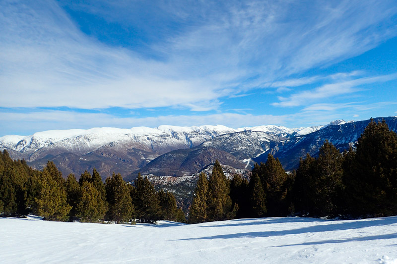 Un cop estiguem preparats, i sense oblidar-nos de dur aigua suficient perquè ens disposem a recórrer força quilòmetres sense trobar ni una sola font, començarem la nostra excursió amb raquetes de neu buscant les pistes que surten a la part alta de l’aparcament, de les que agafarem la que puja per damunt i que ascendeix en diagonal fent un revolt que ens endinsa ràpidament a un bonic bosc de pins.