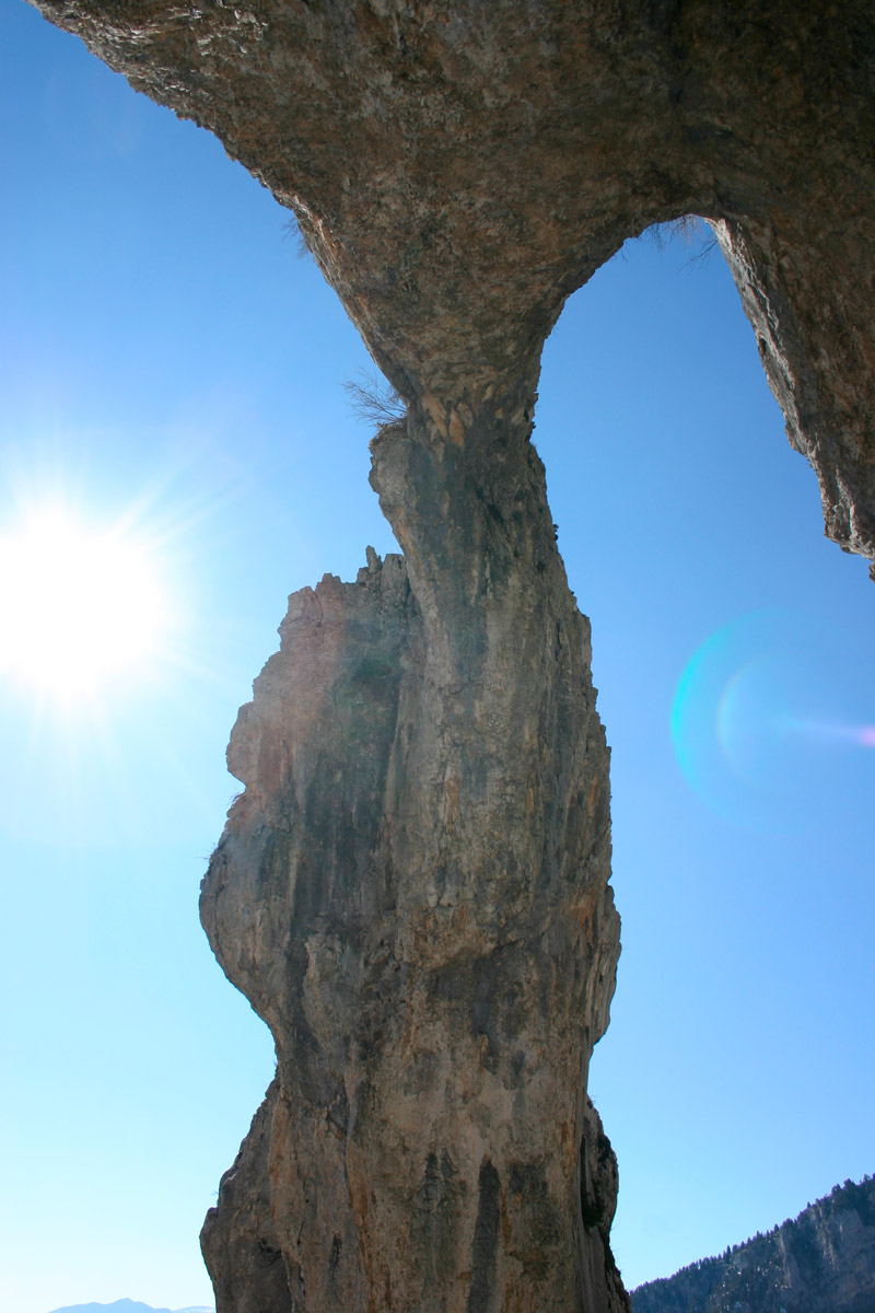Un cop ens hem refet de la pujada, buscarem a la part superior de la Pleta dels Cortals un sender que davalla fins al torrent de la Muga en un punt força encaixonat i molt bonic. Creuarem el torrent tot buscant a l'altra banda d'aquest les fites que indiquen el camí per remuntar fort i amunt per un tram de tartera molt inclinada bo i cercant els passos més evidents, evitant la malesa i tendint a buscar les parets de roca a la nostra esquerra fins a arribar a una clariana molt gran entre les mates just sota la cinglera, on ens resultarà impossible no quedar amb la boca oberta en observar el gran pont de roca que s'alça a la nostra esquerra.