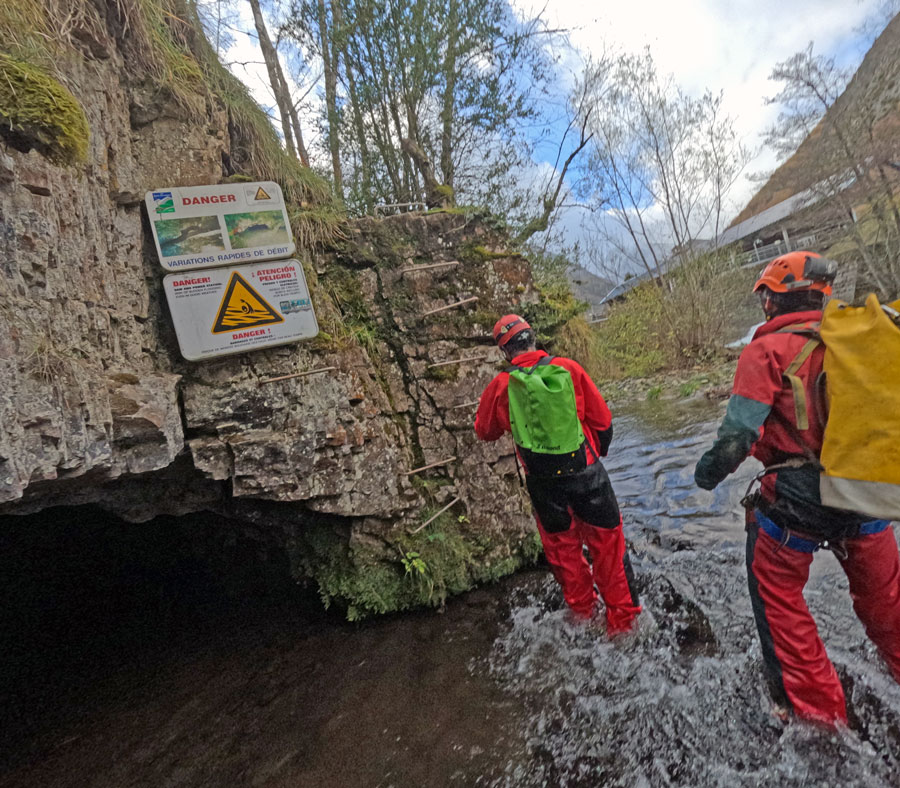 Un cop estiguem a punt, ens fixarem a les casetes que hi ha a l'altra banda de la carretereta per on hem vingut, a la seva dreta hi comença un camí que ens durà a l'entrada en tant sols quinze minuts. Això sí, cal parar atenció, ja que el camí més evident ens farà errar (tal com ens va passar a nosaltres), ja que porta a una altra boca. Nosaltres hem de seguir direcció sud-est cap al torrent o Ruisseau du Goulier, ja que l'accés per la galeria dels pous és just a la llera d'aquest torrent, la identificarem fàcilment pel rètol d'advertència que hi ha al damunt.