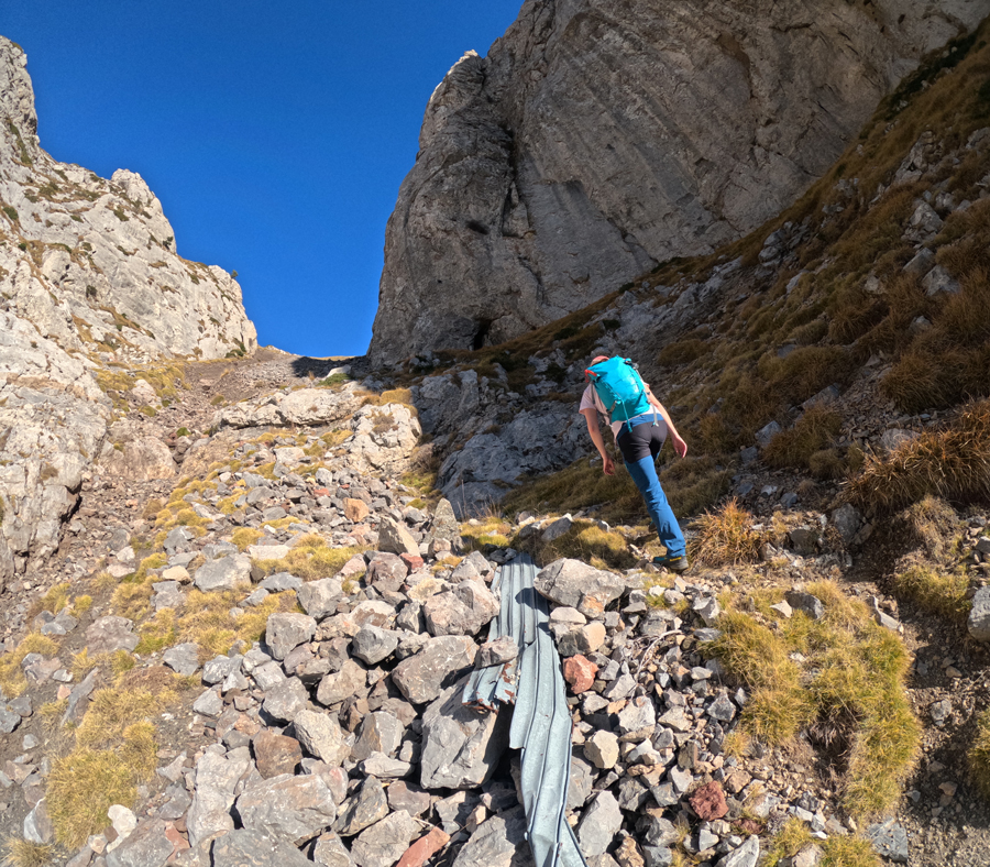 A partir d'aquí comença l'aventura de veritat, i és que cal que posem tots els sentits en seguir el sender i no perdre'l, ja que a estones el camí és tan poc definit que qualsevol rastre de pas d'animals ens pot desviar del sender. La tendència general del sender és d'anar vorejant la muntanya cap a l'Oest amb un ascens progressiu i creuant dues tarteres.